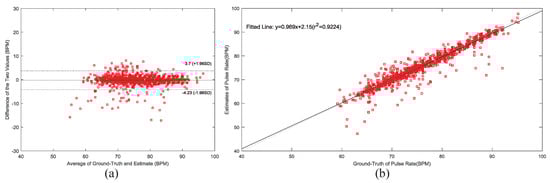 The Bland-Altman plot and Scatter plot: (a) Bland-Altman plot over 8 recordings. (b) Scatter plot between the ground-truth and the estimated PR values over 8 recordings.