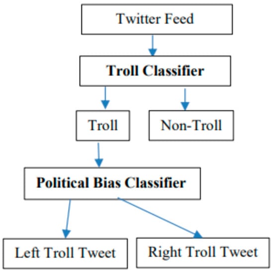 Another work [] used data from the platform Twitter to train a model titled Political Bias Detector. This detector classifies trolls according to their political orientation on right-wing and left-wing trolls. It consists of two classifiers the Troll Classifier and the Political Bias Classifier, as you can see in Figure 1.