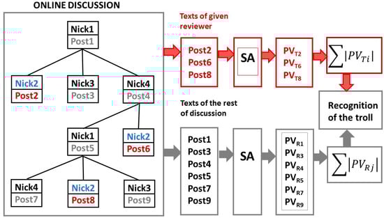 Parameter PVTi is the average polarity value of texts of examined reviewer-probable Troll (index Ti) and PVRj is average polarity value of the other texts of the given online discussion—the rest texts (index Rj). The opinion polarity values were obtained using our lexicon-based application of SA (sentiment analysis). In Figure 2, the examined reviewer is Nick2. His texts (Post2, Post6 and Post8) are compared with the other texts of discussion from the point of opinion polarity