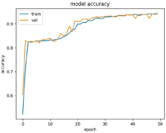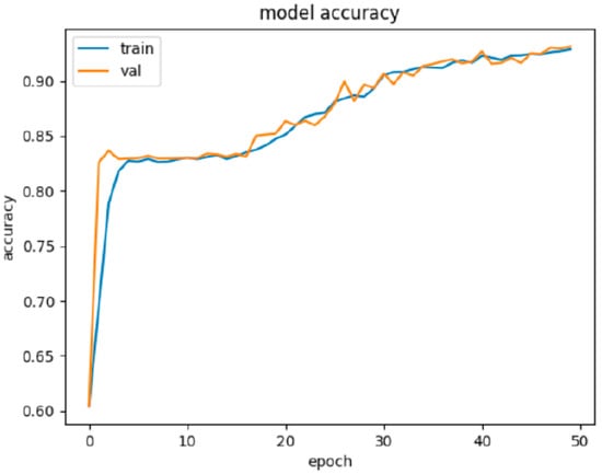 Graphic visualization of the progress of NN1 learning on the training and validation set. We can see that learning was very effective in the first few epochs and accuracy above 80% was achieved very quickly. This was followed by a phase of stagnation of the learning process up to the breakthrough somewhere around the 17th epoch, when accuracy began to grow again and achieved over 90% of accuracy after 50 epochs.