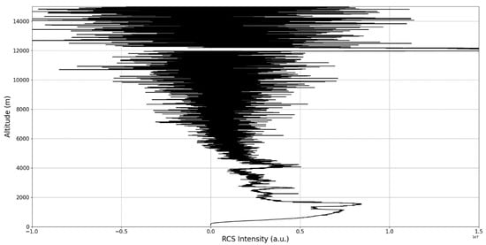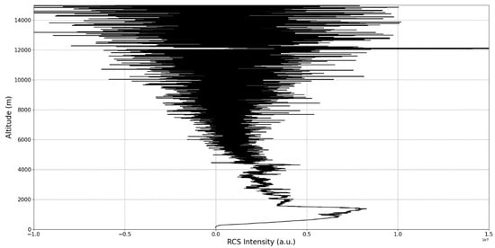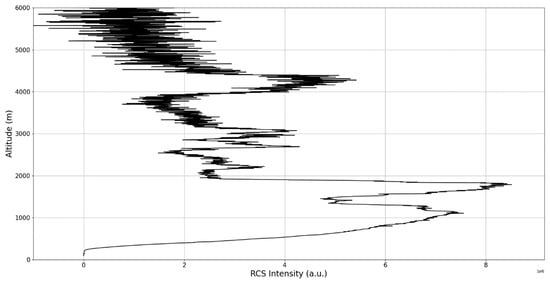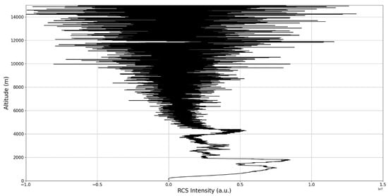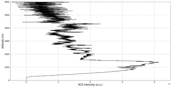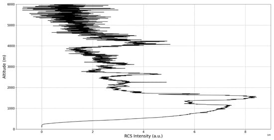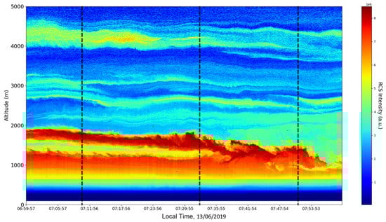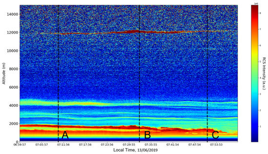 After the visual analysis of this RCS dataset, three significant points in the time series, namely , and , are chosen, which shall be named “point A”, “point B”, and “point C”, respectively. These three points seem to be the initial times of certain atmospheric evolutions that are most visible, and the location of these evolutions and trends shall be arbitrarily determined (Figure 1, Figure 2, Figure 3, Figure 4, Figure 5, Figure 6, Figure 7, Figure 8 and Figure 9). The position and profiles associated with these three points have been delineated consecutively with three dashed black lines.