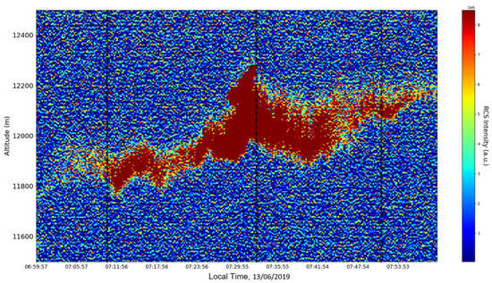 : Lidar data show that the atmospheric formation is only just appearing at this point; this might reflect indeterminacy. The analysis shows indeterminate, opposing V-shaped channels. There is some correlation between RCS data evolution and analysis (Figure 10).