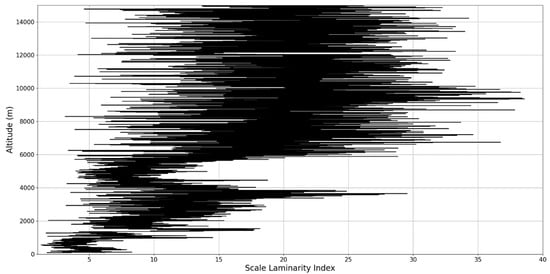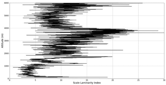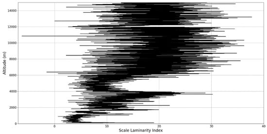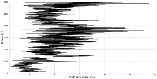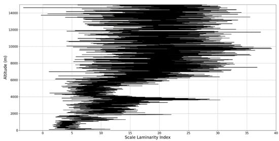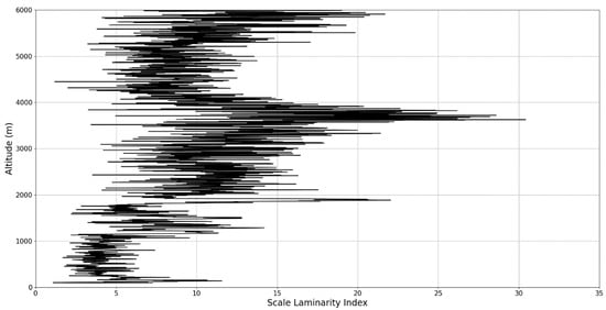 In any case, after this connection to lidar data, scaling models and the logistic map has been performed, it is then possible to approximate whether or not certain stages of atmospheric turbulence, at a given altitude and time, present quasi-laminar behavior. Turbulent or laminar flow regimes can be identified in this manner throughout the atmosphere, because for certain initial values, and at certain scales and periods, it is then possible to arrive at such values that characterize laminar regions of the logistic map, which would imply that, at certain scales and altitudes, atmospheric flow can spontaneously exhibit laminar or quasi-laminar behavior. This can then be used to construct a new measure of turbulence or lack thereof, named the “scale laminarity index”: