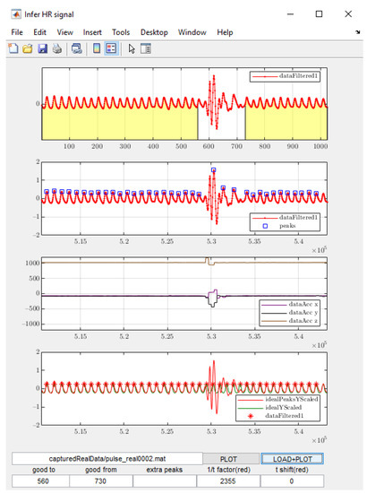 - For each 32 s signal, the person wearing the sensor was asked not to move for a few seconds at the beginning and end of the sampling time. In this way, the automatic peak detection algorithm was able to correctly detect the peaks at the beginning and the end of each signal. Those two movement-free periods at the beginning and end are denoted as Time Window A and Time window B, respectively.
