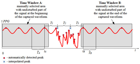 In the two windows manually selected by the human operator—Time Window A and Time Window B—the peaks of the signal should already be automatically correctly detected online during signal capture by the peak detection algorithm because the signals were not disturbed. The time difference between the last two peaks of Time Window A is denoted as TA. Similarly, the time difference between the first two peaks in Time Window B is denoted as TB, as shown in Figure 4.