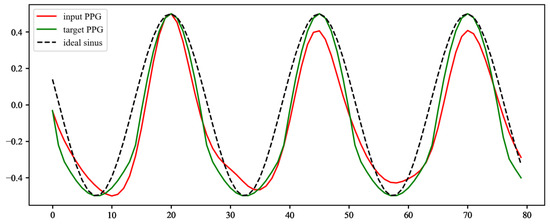 Correction of ideal target sinusoidal waveform to resemble real PPG signal. The target waveform is calculated from the ideal sinusoidal waveform (ideal sinus) according to Equation (6) and normalised (target PPG). In this simple way, the target PPG better resembles the real PPG signal (input PPG).
