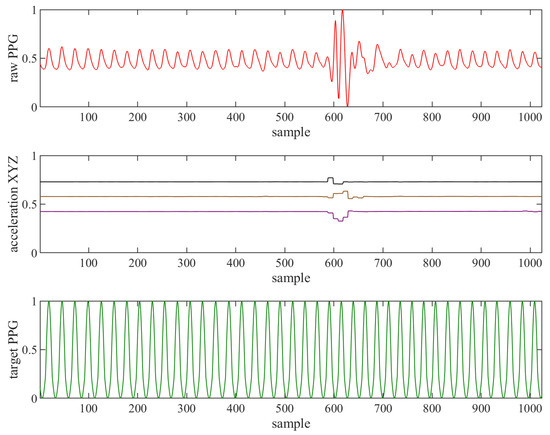 The Input layer decides the format of the input data to the neural network. Each captured signal: raw PPG, acceleration X, acceleration Y and acceleration Z, accompanied by the target PPG, was normalised and segmented into training sequences of length L, as shown in Figure 8.