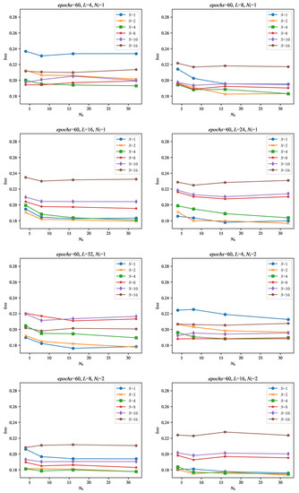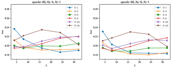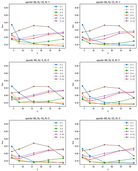Selected evaluation results of the networks during training as a function of the number of epochs. Evaluation was performed with the set of 29 evaluation signals, separate from the training data, for the selected configurations of networks: Nl = {1, 2}, Nh = {4, 32} and input data size: L = {4, 32} and sampling: S = {1, 2, 4, 8, 10, 16}. The loss is calculated as an average evaluation loss of all of the evaluation signals.