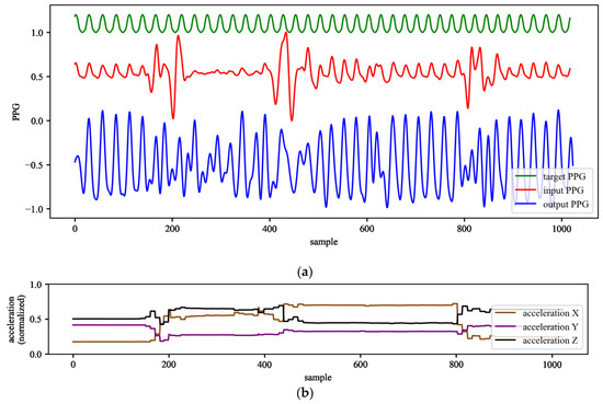 Example of PPG signals before and after processing with the trained LSTM network (a) and example of input acceleration signals (b). For this example, the following network variant was used: L = 4, S = 2 Nh = 32, Nl = 1 with the input waveforms from the validation dataset.