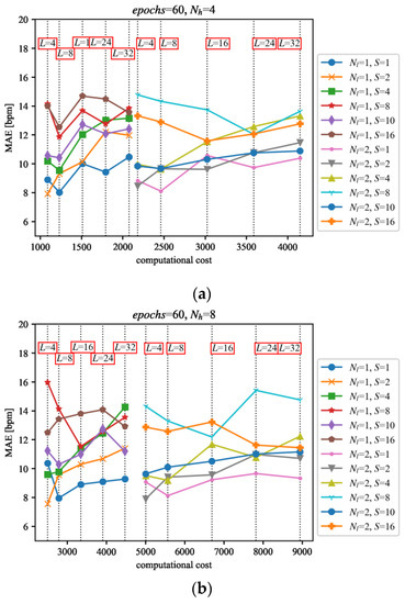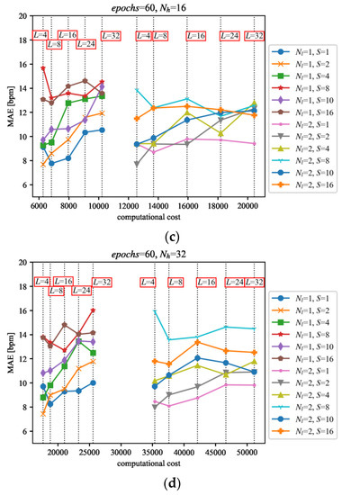 Results of the tests of the LSTM network variants on the PPG dataset [24], trained on the dataset described in Section 4 for the following parameter values: (a) Nh = 4, (b) Nh = 8, (c) Nh = 16 and (d) Nh = 32. The evaluation results (vertical axis) were confronted with the computational costs (horizontal axis) estimated as the approximate number of basic maths operations [27].