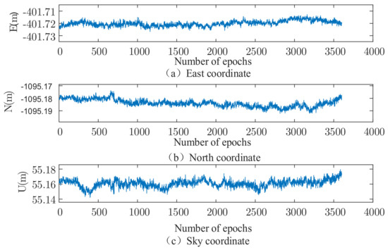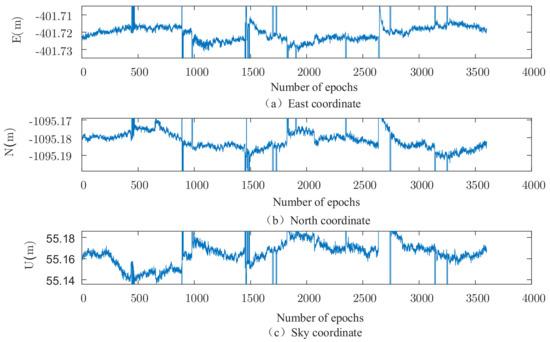 In order to analyze the performance of the robust extended Kalman filter algorithm, this subsection analyzes and verifies its performance by means of measured data. The data were collected from a monitoring station in the deformation monitoring area of a mining area in Inner Mongolia for a total of 3600 calendar elements (time corresponding to data), and measured data are collected from monitoring Station 1 in the deformation monitoring area of a ship lock in Hengxian County, Guangxi for a total of 3600 calendar elements.