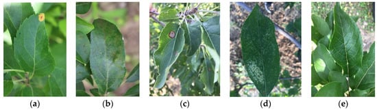 Example of apple leaf images: (a) rust; (b) scab; (c) ring rot; (d) Panonychus ulmi; (e) healthy.
