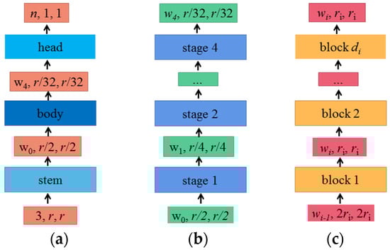 Figure 2a shows that the RegNet network is mainly composed of three parts: stem, body, and head. This network keeps the backbone and head network as simple as possible, mainly focusing on the structure of the network body.