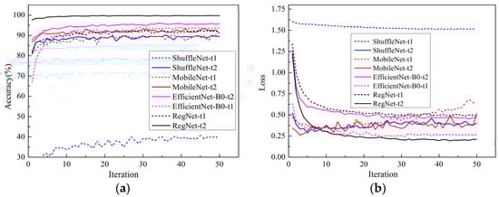 In order to avoid memory overflow, a batch training method was adopted to compare the RegNet model with EfficientNet-B0, MobileNetV3, and ShuffleNet on the training set and validation set. Each batch was trained with 16 images, and the batch size of the validation set was also 16 images. In this paper, the number of iterations was set to 50, and the categorical-cross entropy in Keras was used as the cost function. Batch normalization was introduced to standardize the input of the hidden layer.