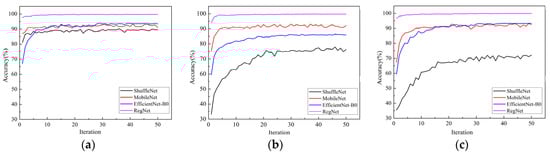 According to Figure 5, from the sensitivity of the models to the optimizers, the four models trained by the Adam optimizer all showed good performance. The average accuracy of the RegNet model trained by the Adam optimizer is as high as 99.8%. When Figure 5b,c are compared with Figure 5a, it can be seen that the convergence rate of the four models is slower when using the Radam and Ranger optimizers than when using Adam, and there is a great difference between the best accuracy of the models. When the Adam optimizer is used, the four models achieve the best convergence state, and the differences between the best accuracy of the models are small. This showed that the models trained by the Adam optimizer can obtain a better classification performance; that is, the optimizer Adam had better universality to the models.