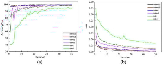 It can be seen from Figure 6 that when the learning rates were 0.05, 0.01 and 0.005, the curve oscillated seriously, converged slowly, and the loss values of the model were higher and the accuracies were lower. When the learning rate was 0.05, the curve oscillated most severely, and the model had not converged when it reached the maximum number of iterations, indicating that the learning rate was too high; the parameters that need to be optimized will fluctuate without convergence. According to Table 3, the accuracy of the model was as low as 94.61% when the learning rate was 0.05.
