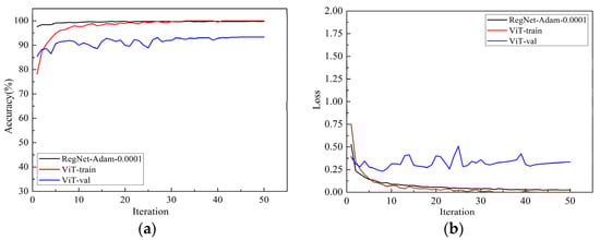 The average accuracy and loss function curves of the models ViT-B/16 and RegNet on the training set and validation set were shown in Figure 8. The black curve was the performance curve of the RegNet model, and the red curve and the blue curve were the performance curves of ViT model on the training set and validation set, respectively. ViT-B/16 means the “Base” variant with a 12 × 12 input patch size.