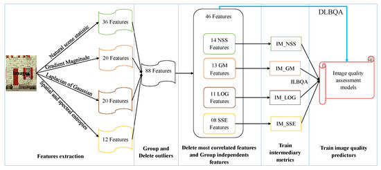 The proposal of this paper is a non-distortion-specific - approach, where the extracted features are based on a combination of the natural scene statistic in the spatial domain [28], the gradient magnitude [29], the Laplacian of Gaussian [29], as well as the spatial and spectral entropies [30]. These features are trained using machine learning methods to construct the models used to predict the perceived image quality. The process we propose for designing the evaluation of perceived no-reference image quality models is described in Figure 2. The process consists of