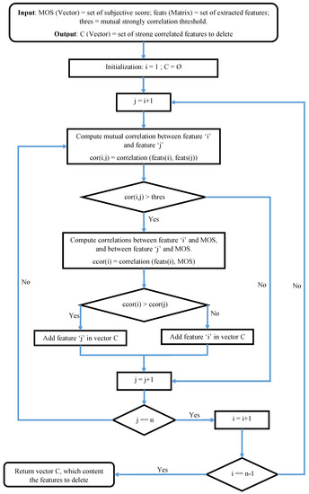 The strongly correlated features give approximately the same information, and this redundancy may cause overfitting problem in the estimation process of the model parameters, and can also produce uselessly complex final models. The proposed way in this paper in order to avoid these problems is to remove the strongly correlated features. The suppression of features is based on the following idea: “if there are two strongly correlated features in the set of extracted features, with a mutual correlation greater than a predefined threshold, we remove the one that has the least correlation with the subjective score without significant loss of information”. This reduction process is clearly described in Figure 3, which takes as input the set of extracted features, and produces the set of superfluous features.