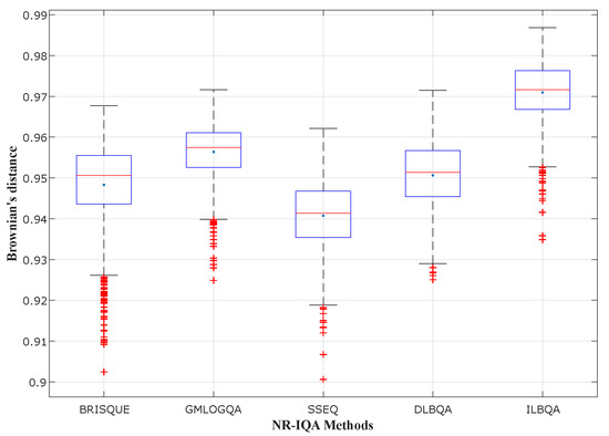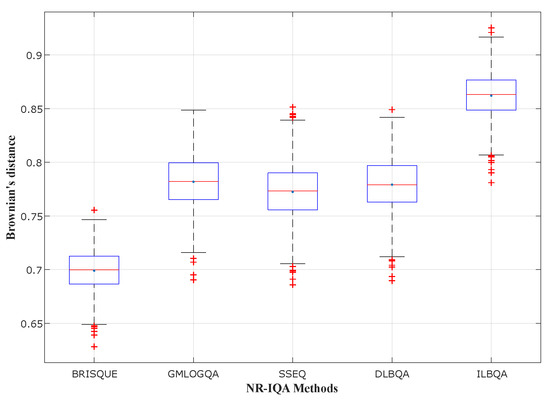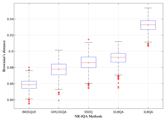 The run-time of the produced model is compared to the run-times of five other good NR-IQA indexes: BLIINDS-II [50], DIIVINE [26], BRISQUE [28,36], GMLOGQA [29], and SSEQ [30]. Table 10 presents the estimated run-time for an execution on CPU, in second(s), of the different methods, for a image with resolution , on MATLAB, using a computer with RAM and Intel Xeon dual-core CPU, GHz for each core. We observe that the run-time of the proposed method () is significantly inferior to and - run-time, approximately equal to run-time, and superior to and run-time.