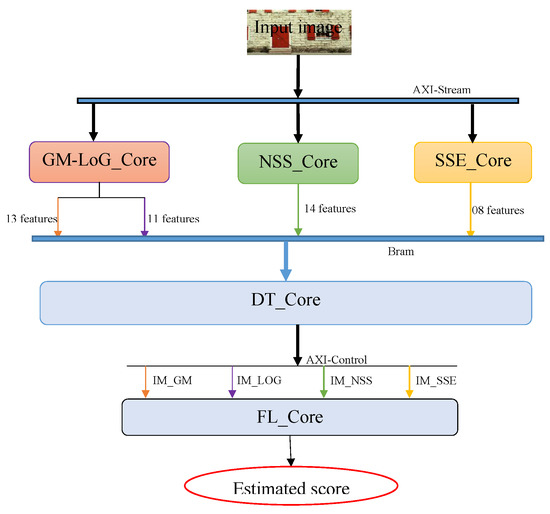 - Feature extraction: the entries of this group are, the image whose quality is sought to be evaluated, as an AXI-stream, and the dimensions of this input image (row and column sizes as an integer). It contains three IP-cores: which extracts 14 features on the image; - consisting of extraction of 13 and 11 features on and axes, respectively; and which extracts 08 features.