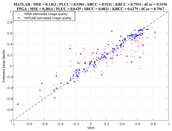 120 images distorted by 24 types of distortion, from the image database [41,42] were evaluated by the produced models on the platform. The implementation results were compared to the experimental results under and also to the subjective scores taken the image database.
