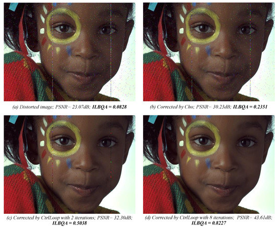 Our NR-IQA process has been used in a control loop process [51] to assess the quality of an image and decide if that image needs correction. Gaussian noise is inserted in a reference image, resulting in distorted image illustrated in Figure 10a, with a very low score like show in the figure. Figure 10b–d shows the corrected version of the distorted image presented in the graph (a), by the control loop process based on the image quality assessment. Each graph also presents the between the reference image and the corrected image, as well as the blind image quality () score of each image. The graphs (b) and (c) of the Figure 10 show the intermediary corrected images, while the graph (d) presents the best-corrected image by the process.