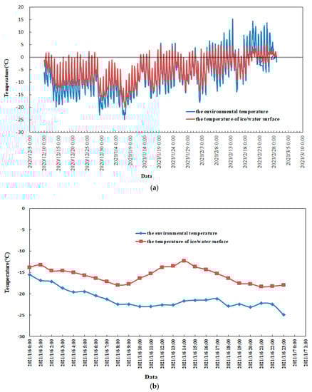 - The temperature change process in the 2020–2021 ice period was continuously monitored. The minimum environmental temperature was −24.93 °C at 23:00 on 6 January, and the minimum ice temperature was −19.97 °C at 1:00 on 7 January in the 2020–2021 ice period.