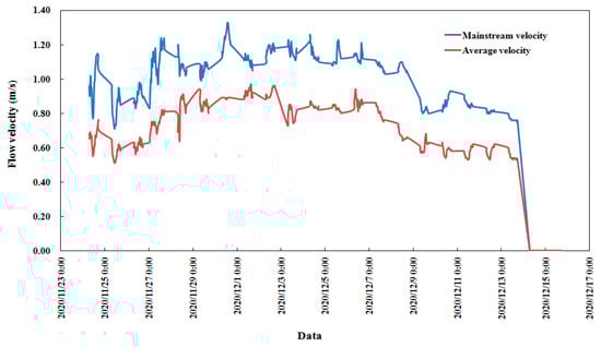 According to the observation and analysis of the test equipment and combined with image recognition technology, the flow ice velocity and density of 2020–2021 were obtained. The evolution process of the flow ice velocity is shown in Figure 6. The first flow ice of the 2020–2021 ice period in the Shisifenzi reach of the Yellow River appeared on 24 November 2020. The river was frozen on 14 December 2020. Two kinds of flow velocities are described in Figure 6: One is the flow ice velocity in the mainstream region of the river, and the other is the average flow ice velocity of the section. The maximum flow ice velocity is 1.33 m/s, which is in the mainstream velocity region. The average flow ice velocity is 0.5–1 m/s. The flow ice velocity was relatively stable during the whole flow ice period of 2020–2021.