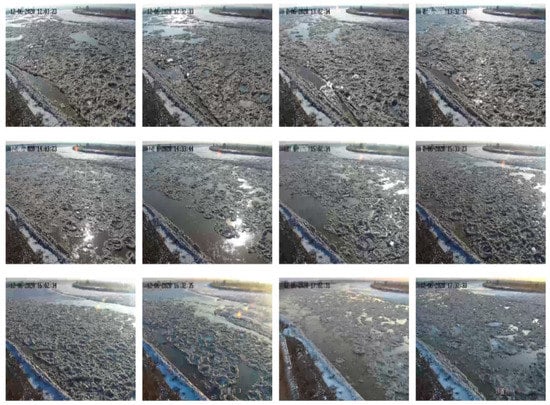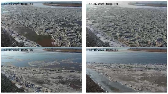 Around the 1980s, scholars worldwide carried out field observations of river ice regimes. Parkinson [] and Marsh [] effectively observed the water temperature under the ice cover during the freezing period and during the river breakup period, and Gerard [] observed the cracking process of river ice. In recent years, to ensure the personal safety of observers, some new observation technologies have emerged. For example, Ford et al. [] used an ice plug thickness meter to observe the ice thickness, Morse et al. [] used the Acoustic Doppler Current Profiler (ADCP) to measure the floating ice velocity and ice cover thickness at specific points, and Jasek et al. [] used a SWIPS system to measure the ice sheet growth and ice melting speed.