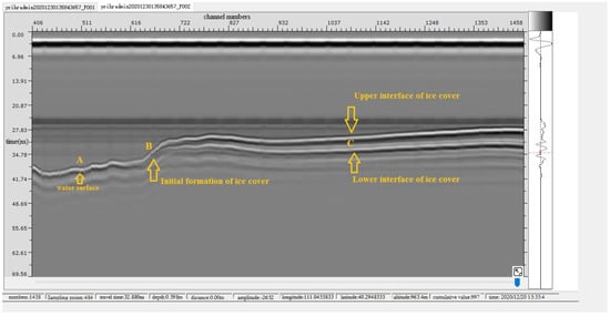 Based on the suspended air-coupled geological radar technology, ice thickness and water level data were obtained. The change process of ice thickness and water level in the early stage of river ice freezing of the Shisifenzi reach is shown in Figure 10. According to the different characteristics of radar spectrums in different substances, the ice thickness is analyzed and calculated. There was no ice cover formation at the time of A point in Figure 10. Two different radar wave spectrums appeared at the time of point B in Figure 10, indicating that the initial ice cover began to form. Thereafter, the ice thickness gradually developed, and the water level gradually rose. There has been a very obvious upper interface and lower interface of ice cover at C point in Figure 10. The phenomenon is that the evolution of ice thickness and the change process of water level are well described in Figure 11 during the ice periods of 2020–2021. The ice thickness data of this reach were first accurately captured on 11 December 2020. On 18 January 2021, the ice thickness of the river section below the observation point reached the maximum value of 52 cm. On 26 February 2021, the ice cover broke up, floating ice drifted downstream, the ice thickness data disappeared, and the water level decreased significantly, indicating that the river section opened up. From 3 to 8 March 2021, the ice thickness was still measured at the Shisifenzi section, which was mainly caused by floating ice accumulation from upstream.