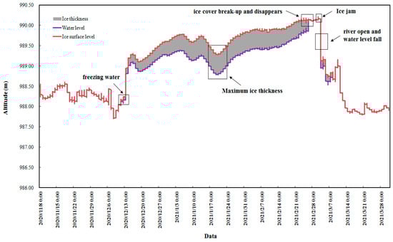 - The first ice thickness data were accurately captured on 11 December 2021. The maximum ice thickness reached 52 cm. On 26 February 2021, the ice cover broke up, floating ice drifted downstream, the ice thickness data disappeared, and the water level decreased significantly, indicating that the river section opened up. From 3 to 8 March 2021, ice thickness was still measured at the Shisifenzi section, which was mainly caused by floating ice accumulation from upstream.