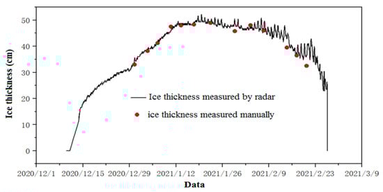 Comparison diagram of ice thickness results measured by radar and manual methods in the 2020–2021 ice period.