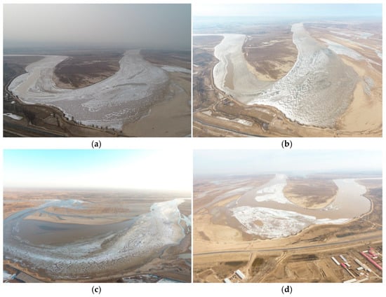 Since the equipment is fixed, it can observe only the local ice situation and water changes of the Shisifenzi River section and cannot characterize the river ice changes over a wider range. Next, on the one hand, fixed observation points can be added at other typical sections of the Yellow River. In addition, additional monitoring equipment for ice-related parameters can be added to the system, such as spectrum equipment, ice velocity equipment, and solar radiation monitoring equipment. On the other hand, UAV aerial surveys can be combined with fixed-point monitoring, and the river ice change law can be better characterized. The typical change processes of ice generation and disappearance in the Shisifenzi River section are shown in Figure 13, which were measured by UAV. Figure 13a shows the process of ice accumulation and river freezing, Figure 13b shows the stable freeze-up river period, Figure 13c shows the stage of temperature rise and ice cover melting, and Figure 13d shows the ice breakup and river opening. During the river ice breakup period, the ice cover gradually melted, and the river ice slowly broke up. The macroscopic observation of ice by UAVs and the local microscopic observation of ice by fixed-point equipment can form a better complement.