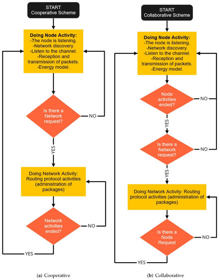 In a cooperative scheme [48,51], the node is more committed to the other nodes since it shares its resources by following strict rules and protocols in order to fulfill certain assigned functions that help the entire network. The node must first cover the priorities of the network and then its own. On the other hand, in the collaborative scheme [48,51], the wireless element shares its resources only when it is available and its operation is not compromised and only if its priorities are covered first. As seen in Figure 2a, the cooperative scheme gives preference to the network since, at any request from the network, it stops performing its activity to perform the activity that the network asks. On the other hand, Figure 2b presents the collaborative scheme, which consists of a synchronous scan of the nodes, in which it needs to finish the node’s task in order to attend a request for the network. The two types of schemes are understood as mutually exclusive, so it is convenient to find the possible uses that can be given to each of the two classes, either in normal operating conditions or in a state of jamming attack.