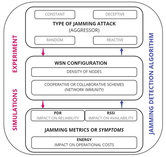 The hypothesis of this work is that a WSN can be protected from jamming using a mechanism for its detection, which is based on performance metrics and uses cooperative and collaborative schemes for any density of nodes. To accept or reject this hypothesis, we have designed a jamming detection mechanism. The mechanism is showed in Figure 3 and is carried out in two directions. First, the down arrows indicate the way simulations and experiments with jammers bring information on how jamming attacks impact performance metrics. Second, the up arrows indicate the way in which a jamming detection algorithm obtains the type of jammer that is attacking the network.