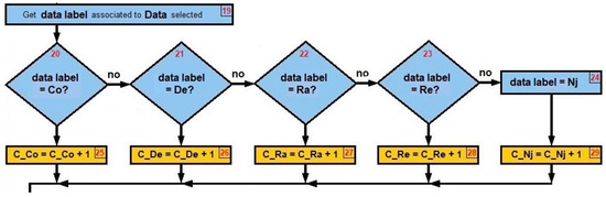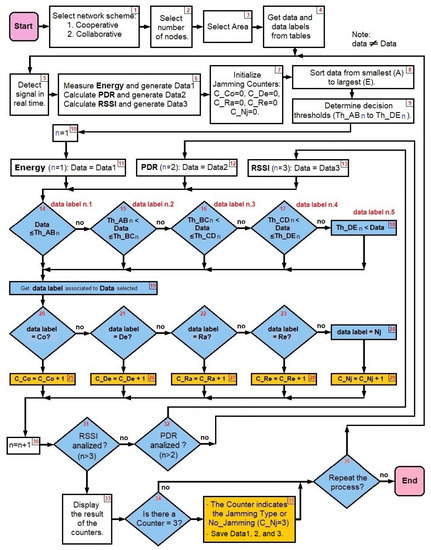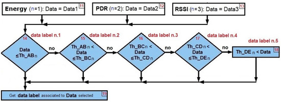 Figure 4 can be written as a pseudo-code (see Algorithms 1–4). The energy comparisons are made first (when n = 1), taking the energy data in real time and seeing between which decision thresholds that data falls, and consequently we associate the data label to the data selected. A similar process is carried out with the PDR (when n = 2) and the RSSI (when n = 3), taking into consideration that the order of the data from lowest to highest does not always come from the same type of jamming.