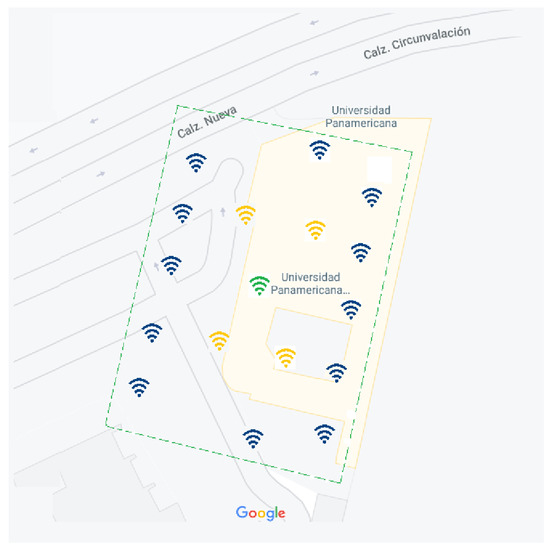 In addition to the simulation, and in order to complement the results of the simulation, measurements will be made from a WSN located in the engineering building of the Universidad Panamericana, Campus Guadalajara. Figure 5 presents a Google Maps search of the area where the WSN is physically installed and a general distribution of the sensors inside the network. Blue nodes are sensor nodes, while the green node is the coordinator and yellow nodes represent the possible jammer nodes. The network resembles the characteristics of an IWSN since in the area there is traffic of people using various mobile devices, cars in constant motion, school laboratories with electrical and computer machines as well as kitchens and offices with ventilation systems and computer equipment.