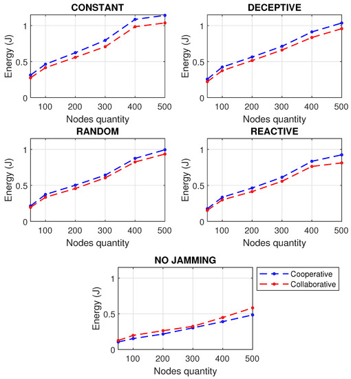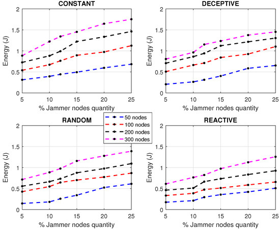 Increasing the number of jammer nodes in the network was used to evaluate and confirm the impact of jamming and different network densities in energy. In the simulation, we varied the quantity of jammer nodes present in the network, and the energy level variation of the network could thus be obtained for different types of jamming. Figure 7 presents the different results that were found when increasing the amount of nodes giving jamming interference to the network. When faced with networks with different numbers of nodes, the behavior they present when the number of jammer nodes increases is an almost linear increase in energy consumption.