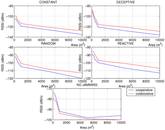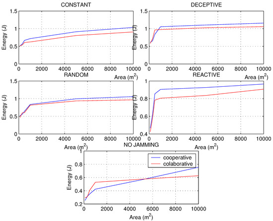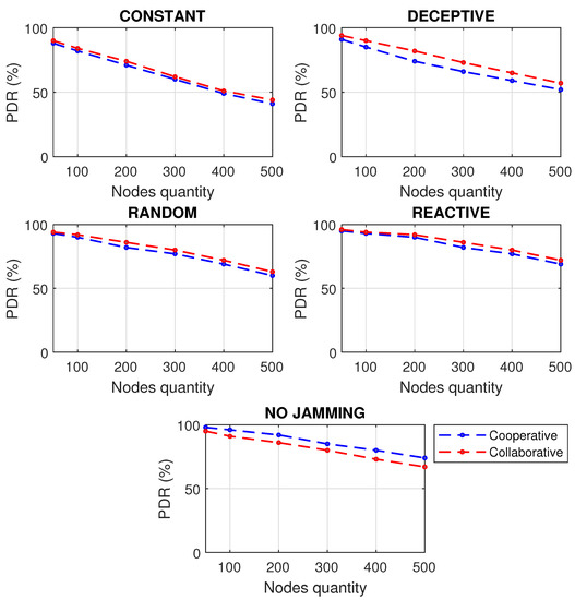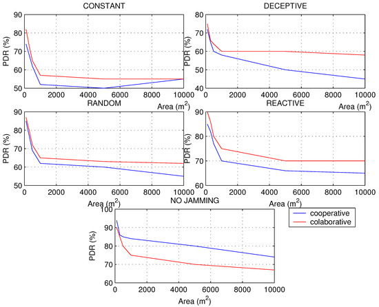 It has been shown in [51] that for a network of 20 nodes, located within an area of 500 m, the cooperative scheme provides better results than the collaborative one when there are normal network operating conditions. In order to relate the different types of jamming and the collaborative and cooperative schemes, an experiment will be carried out in a similar area and condition to determine when it is convenient to use one scheme or the other.