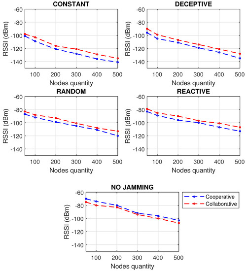 Density. Regardless of whether or not a jamming attack exists, as well as regardless of whether a collaborative or cooperative scheme is being used, it has been shown that by increasing the number of nodes and leaving the fixed area of 500 m (an increase in density), the distances between the nodes decrease, and the symptoms that make us realize this are a decrease in the PDR and the RSSI, and an increase in the energy consumed by the node. This is due to shorter distances between nodes, less space for packet transmission, and increased collisions. When there are more collisions, fewer packets reach their destination, and this is observed in the decrease in the PDR. As noted in Equation (3), it is known that the distance between the sender and the receiver is directly proportional to the energy received and inversely proportional to the RSSI. Notwithstanding all the above, by increasing the coverage area leaving the number of nodes fixed (an increase in density), it was found that everything mentioned above can only be valid for networks with areas less than approximately 1000 m, since with larger areas the behavior is reversed, having for little dense networks a decrease in the PDR, in the RSSI and an increase in the Energy. This makes sense since when data is transmitted at distant distances, there are atmospheric phenomena, noises typical of the environment where the WSN is installed; if it were an IWSN with very large distances, communication could collapse due to the excess of failed attempts to listen to the channel due to the unintentional noises caused by the machines. Both in the simulations and the experiment, it was found that taking the density of nodes as a parameter for detection can give us a guideline for their future mitigation, contributing to the security of the WSN.