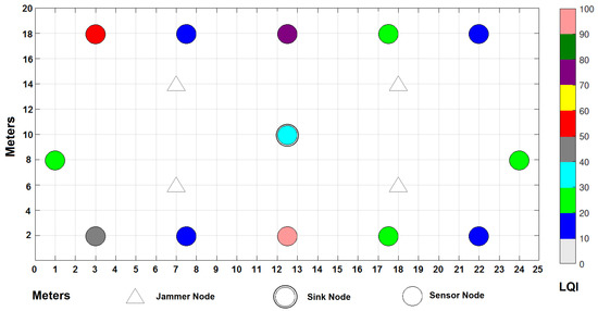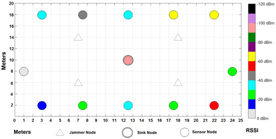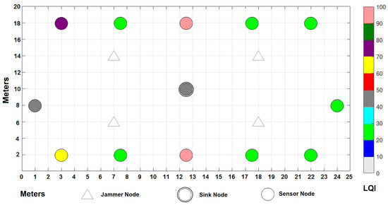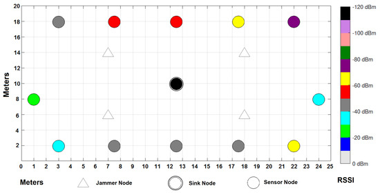 where is the number of packets successfully sent by the source and is the total number of packets transmitted at the source. To detect jamming, PDR must be complemented with other metrics, since its variation could also be related to other factors such as imperfect connections, collisions or neighbor node failures [21]. Another used metric is the Link Quality Indicator LQI, which indicates if the path that a message takes to propagate in a mesh is good in comparison to other paths. An LQI level must be up to 50 to be considered as acceptable, and a value of 120 is very good [22]. The RSSI is the signal strength distribution and can be estimated as [23,24]: