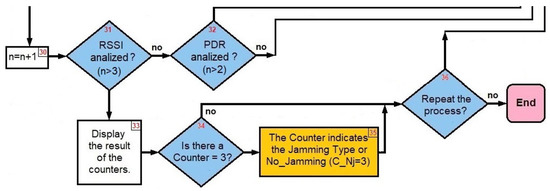 Once the iterations with the three performance metrics are completed, the data label (, , , , ) is associated to the data selected (real-time Energy, PDR and RSSI values), transferring their resulting values to the corresponding jamming type counters, and if the result obtained is equal to three, it indicates the presence of that kind of jamming. In the event that the counter value is one or two, the process must be repeated with other real-time measured data. In the absence of jamming attacks, the no jamming counter will have a value of three. According to the measurements of all the metrics mentioned above, an alarm of the presence of jamming would be produced, indicating what type of jamming the network is facing, so that an algorithm for mitigation can be implemented immediately. In addition, when a type of jamming has been detected, the real-time information that originated this detection can be stored (Step 35) for reference wherein future artificial intelligence or machine learning could be used to improve the algorithm. Through this algorithm, the aggressiveness suffered by the network from jamming can be labeled and the bases for its mitigation can be laid.