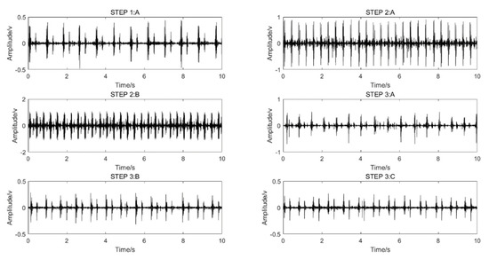 Single-channel heart-sound signals in different states of motion: resting state—Step 1A; state of motion—Step 2A,B; post-exercise state—Step 3A–C.