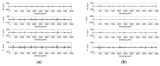 The 4-channel heart-sound signal in 2 states: (a) resting state—Step 1A; (b) state of motion—Step 2A.