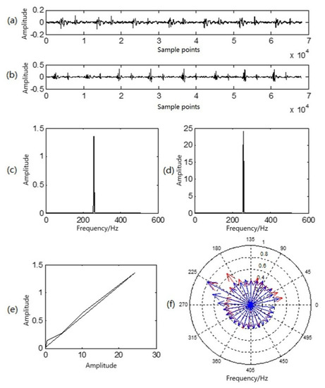 Figure 4a illustrates a waveform of heart sound in a resting state; Figure 4b is a waveform of heart sound in a state of motion; Figure 4c is the sound-direction vector of the heart sound in a resting state; and Figure 4d is the sound-direction vector of the heart sound in state of motion. In Figure 4e, the similarity phase diagram of the two is an oblique line in the first phase limit with an angle of approximately 45°, and the similarity distance was 0.0038. It can be seen that the sound-direction vector of the two was basically unchanged, reflecting that the heart is the sound source and that motion exerts no influence upon the physical acoustic characteristics of the sound source itself. In Figure 4f, the red lines with arrows in the P–P–F phonocardiogram represent the heart sound in a resting state, while the blue lines represent the heart sound in a state of motion. Obviously, there are differences in the heart-sound signals before and after exercise, but the amplitude and frequency of the two at the highest point of the amplitude almost overlap, which corresponds to the peak in the sound-direction vector. As a result, the P–P–F phonocardiogram effectively and intuitively reflects this difference. Moreover, motion here shifted the overall P–P–F phonocardiogram to a higher location.