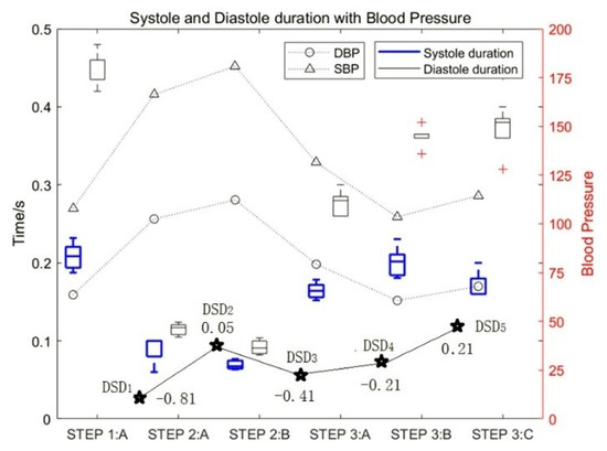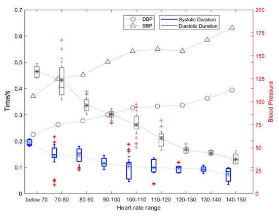 The test data for all subjects were divided according to the subjects’ different heart-rate intervals. The influence of heart-rate changes on the duration of the diastole and systole and the corresponding change rules of blood pressure are shown in Figure 7. Figure 7 shows the results of the overall analysis.