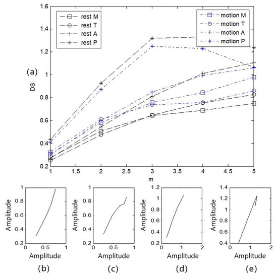 As shown in Figure 8, (1) due to the different auscultation positions of the four channels of the heart-sound signals, the state-change-trend chart for each channel is obviously different. This difference occurs because the thickness of the chest wall ranges from 1.1 to 3.7 cm, while the volume of the heart is approximately the size of a fist, and the average distance from the stethoscope to the heart is only about 3 cm. The heart as a whole cannot be equivalent to a point acoustic source; the local heart region corresponding to the auscultation area can only be equivalent to a point acoustic source. Thus, the four auscultation areas are equivalent to four different point-acoustic sources in the corresponding heart, and the state change difference value presented for each heart-sound signal is significantly different. (2) The heart-sound signals in a state of motion and a resting state were compared and analyzed. Rest P, motion P, Rest M, and motion M basically showed a parallel arrangement, with similarity distances of P = 0.0011 and M = 0.0006, respectively. Rest T, motion T, Rest A, and motion A first showed parallel arrangements and then intersected. At = 4, the difference value of the state change was the smallest, and Rest T and motion T overlapped at this point, with similarity distances of T = 0.0038 and A = 0.0013, respectively. The maximum and minimum similarity distances in the corresponding state-change-trend graphs were found to be 0.0038 and 0.0006, respectively. This result indicates that the difference between similar distances was 0.0032. (3) The morphological difference value, as a characterization parameter for the nonlinear characteristics of heart sounds, is intuitive and comparable and can be used as a measure for the state changes of heart sounds.