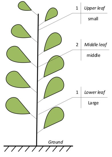 The study area was located in Wuhu Dehong Ecological Agriculture Co., Ltd. (118°12′ E, 31°26′ N), Shuangba Village, Shenxiang Town, Jiujiang District, Wuhu City, China. It has a subtropical temperate monsoon climate, with sufficient sunlight and rainfall. The experimental variety was Wanjiao 177, the planting time was 20 July 2020, and the collection time was 7 September 2020. The pepper samples were collected at the seedling stage. The fertilization level was selected according to the local conventional fertilization level. The pepper leaves are arranged in descending order according to the leaf growth sequence and are divided into upper, middle, and lower leaves. The upper leaves were the smallest in size, while the lower leaves were the largest. The size of the middle leaves was in between the sizes of the upper and lower leaves (Figure 1). The leaves of the pepper plants were artificially plucked. Fifty leaves were randomly collected from three leaf positions of different pepper plants. Hence, 150 leaf samples in total were placed in a sealed bag to keep the leaves fresh, and taken back to the laboratory immediately to obtain hyperspectral image data.