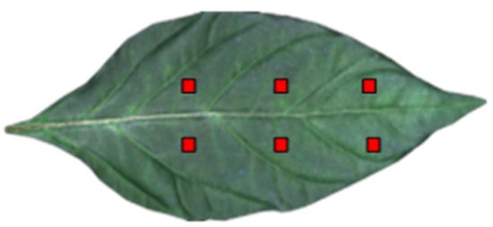 The SPAD-502 Plus chlorophyll meter (Konica Minoita, Tokyo, Japan) was used to measure chlorophyll content. SPAD values can be directly used as relative values to characterize chlorophyll content [12,13,14]. The chlorophyll meter has the following characteristics: measurement area: 2 × 3 mm2; measurement accuracy: ±1.0 SPAD unit; and measurement range: −9.9–199.9 SPAD unit. Each leaf was divided into six plots (as shown in Figure 2). Three measurements were recorded for each plot, and the average value was taken as the final result of the chlorophyll content of the leaves.